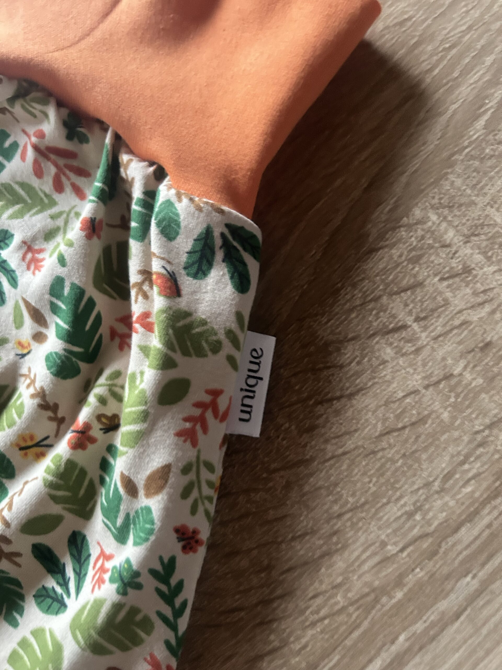 Das verspielte Blätter-Design in Kombination mit den orangen Bündchen macht sie perfekt für Alltag, Kita & Abenteuer.